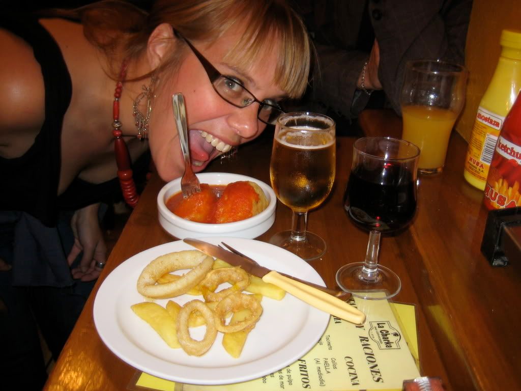 Oh man, it was a feast. First, we had a table full of appetizers: jamón serrano de pata negra (Spanish cured ham--the expensive kind, fed on acorns and free range), ajo blanco (a garlic dip the consistency of hummus), tortilla española (potato omelet), ensalada (salad), fresh bread, queso manchego y nueces (manchego cheese and walnuts), pulpo frito (fried octopus), and a Spanish red wine that, from my understanding, is even better than the wine from the Rioja region-- "Ribera del Duero." Then we had the main dish: paella. It's a rice based dish typically made with seafood and lots of saffron. Ours had mussels, prawns (big shrimp), calamari rings, and fried octopus. It was friggin amazing. It rivals the paella that Cayetana's mom made us the last time we were in Spain. To drink, we then switched to a white wine to match the seafood. It was extremely nice; it was clean and crisp with just a touch of sweetness; think of a Vignoles but half as sweet. I've forgotten the name of it; I'll ask and post it later. Then, after all of that, we had dessert: homemade natillas (pudding). She served it with a cognac soaked cookie on top. To drink, spearmint tea from Morocco, and then as a digestive shot (a typical Spanish practice, actually does help digestion), fig liquor. What a feast! I am so full I'm practically rolling down the street. It's not turkey and pumpkin pie, but...